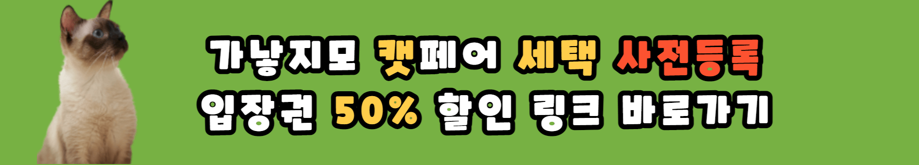 방문하실 분들은 사전예약은 필수인데요, 6월 1일(목)까지 가낳지모 캣페어 홈페이지에서 50% 이상 할인 된 금액으로 입장권 구매가 가능하오니 아래 이미지(배너)를 통해 서둘러 예약해 보시길 바라겠습니다!